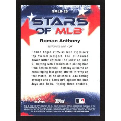 This is a 2026 Topps Stars Of MLB Roman Anthony baseball card. The card is #SMLB-25 and pictures show condition.